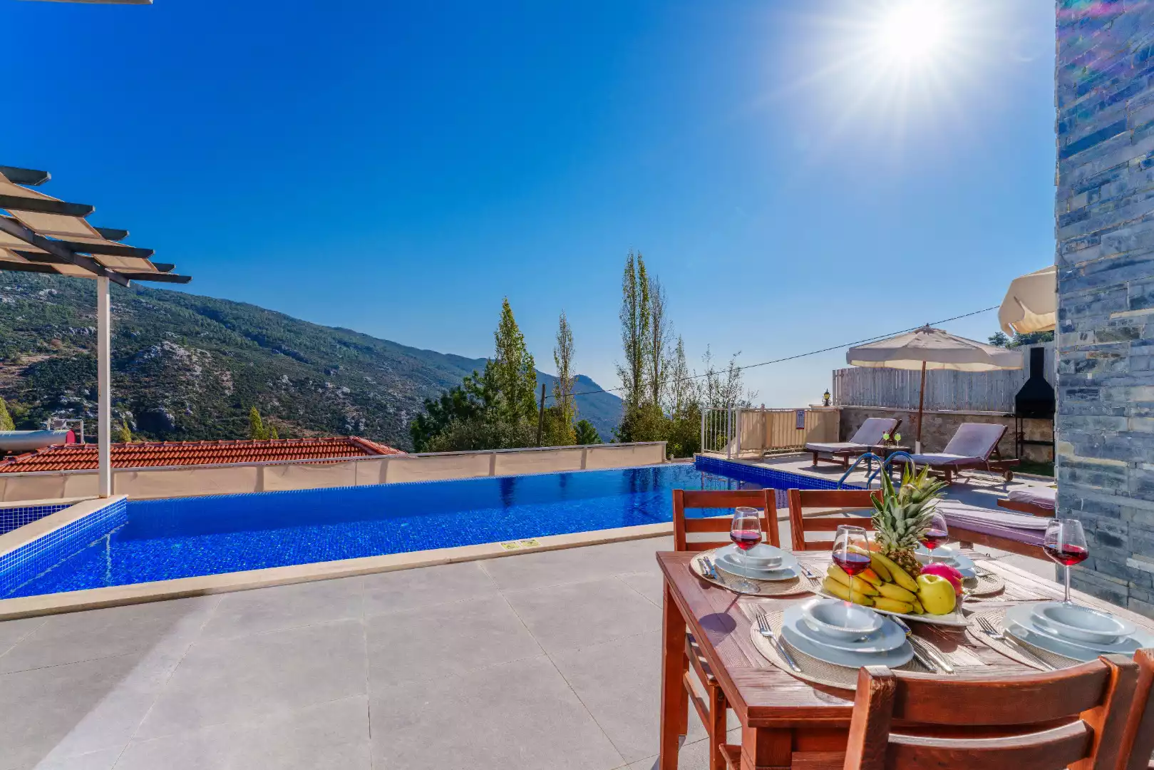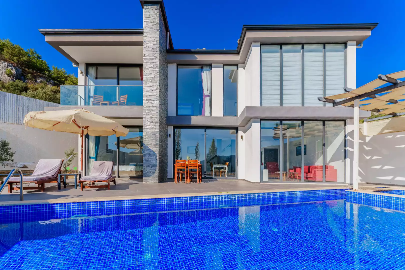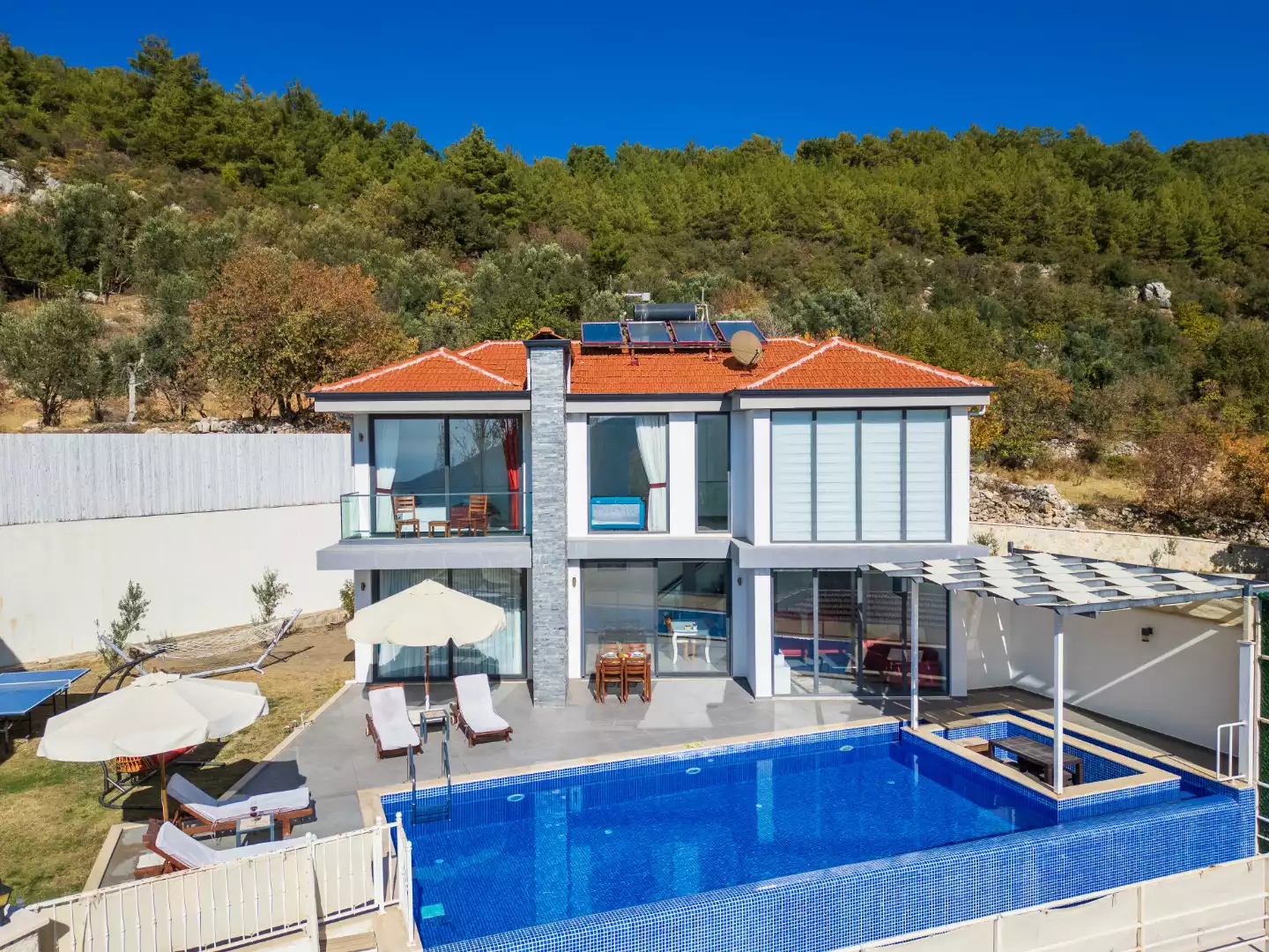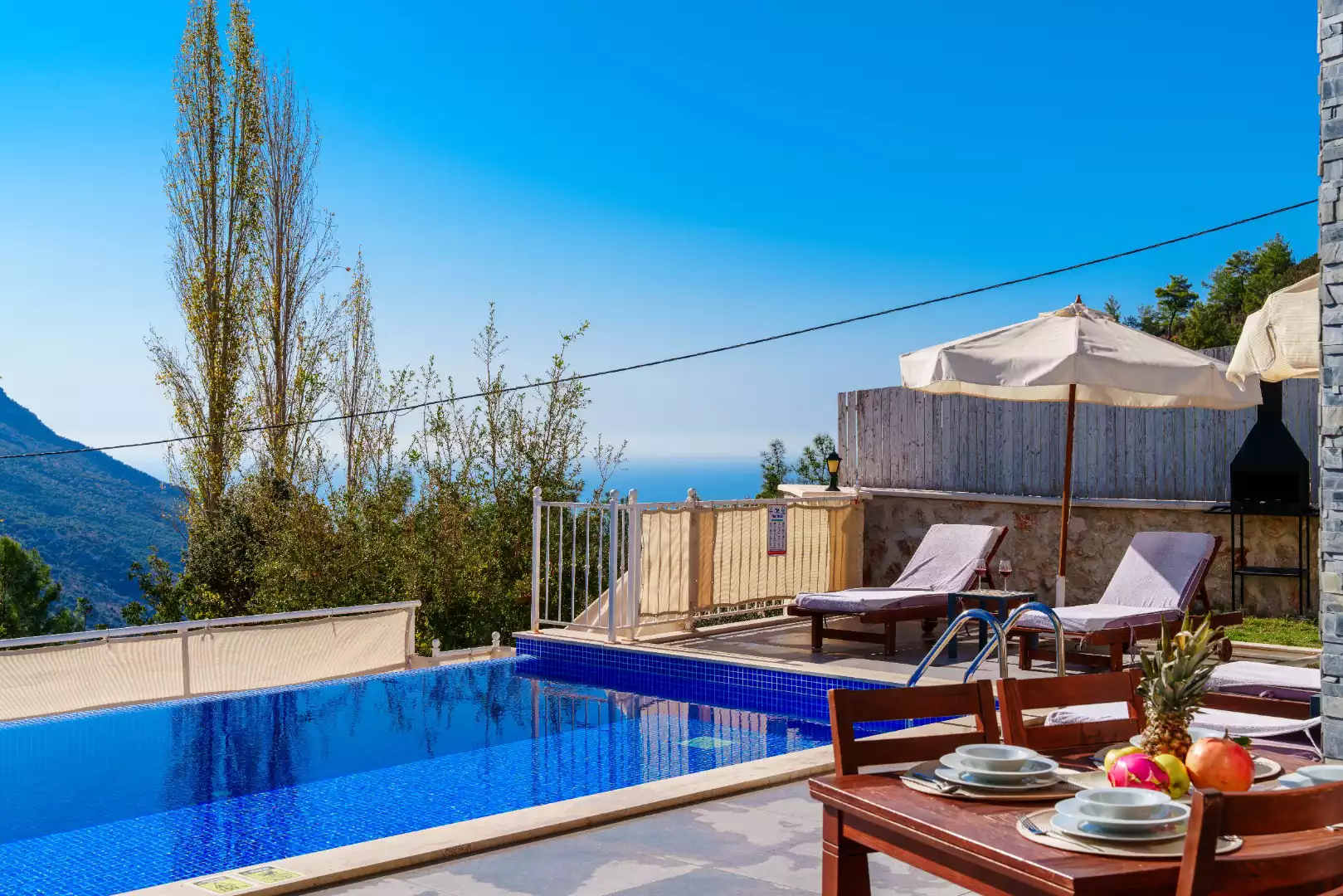 Kalkan İslamlar bölgesinde, şehrin gürültüsünden ve stresinden uzakta, doğa manzarası eşliğinde tatilini lüks ve ayrıcalıklı yaşamak isteyen siz değerli misafirlerimize sunmaktayız.Villa Ustali, muhafazakar villalar, balayı villaları,doğa içerisinde villalar, deniz manzaralı villalar ve jakuzili villalar kategorisinde yer alan villamızın eşsiz doğa manzarasında gün batımını izlemenin tadına varacaksınız. Kiralık Villa Ustali,  havuzu korunaklı villa ve bahçesi dışarıdan görünmeyen, çocuklu aileler ya da balayı çiftlerimiz için unutulmaz bir tatil fırsatı sunuyor. Villamız balayı çiftleri ve muhafazakar aileler için uygundur. Doğayı hissettiren konumu, tertemiz havası ve gözlerden uzakta kalan yapısı ile sizlere özgür bir tatil ortamı sunuyor. Doğa ile başbaşa kalabileceğiniz binamız oldukça lüks bir şekilde dekore edilmiştir. Havuz terası siz değerli misafirlerimizin keyifli bir vakit geçirmesi için oldukça geniş planlanmıştır.Yepyeni dizaynı ile huzur veren villamızın 2  suit yatak odası bulunmaktadır.